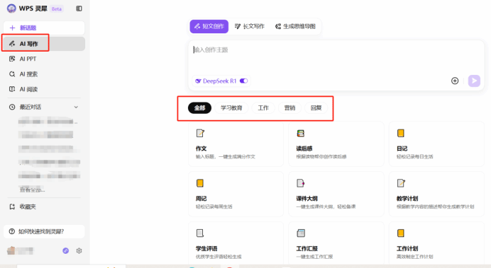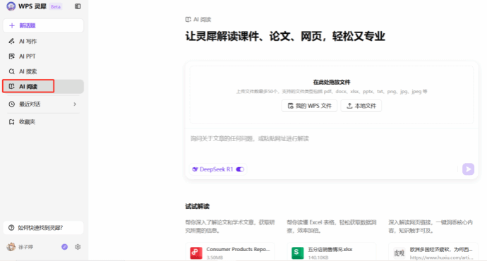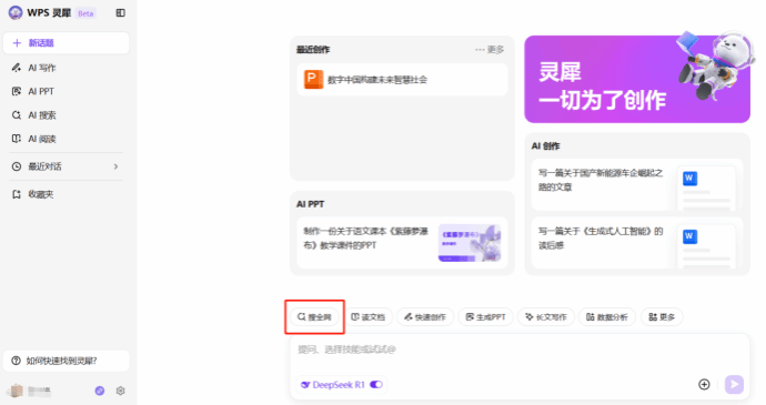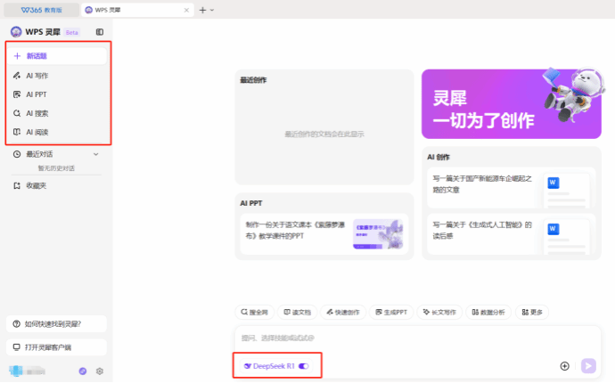 4、點擊左側WPS靈犀,開啟DeepSeek開關