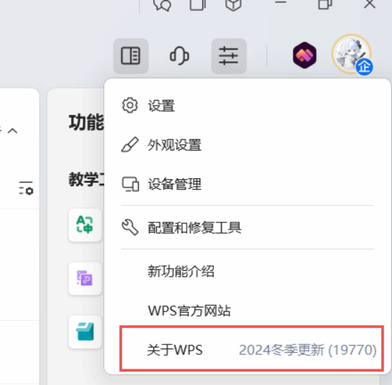 檢查版本方式:點擊右上角【全局設置】,查看“關于WPS”